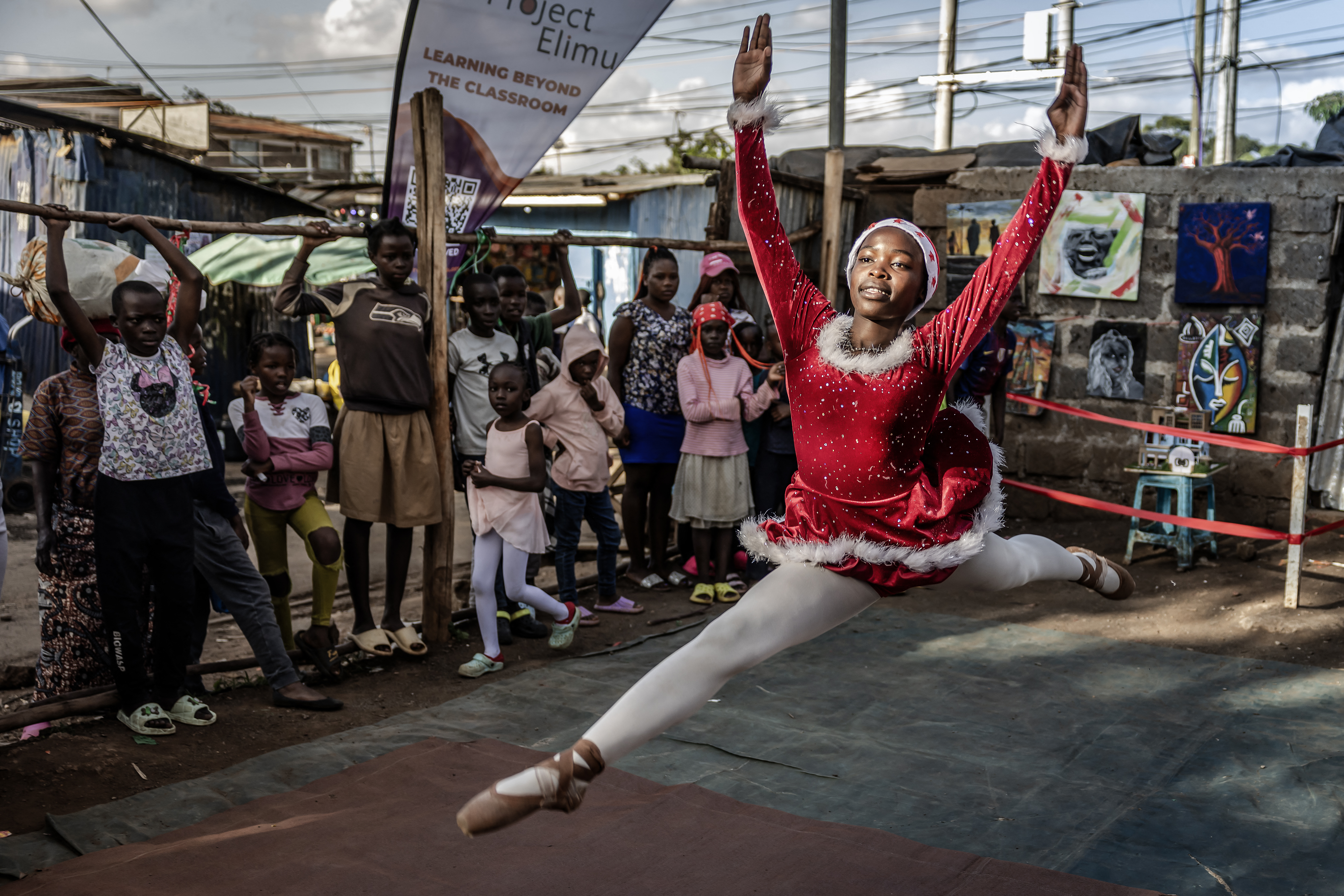 Ballet student Shelly Ajiambo dances in a Christmas performance in the Kibera settlement of Nairobi, Kenya. At Project Elimu’s ballet school, young dancers learn classical ballet as part of a community-led arts program that fosters discipline, creativity and confidence.